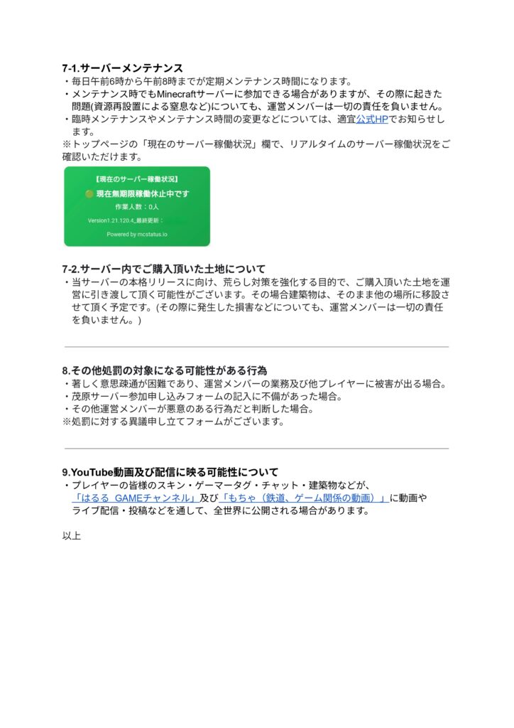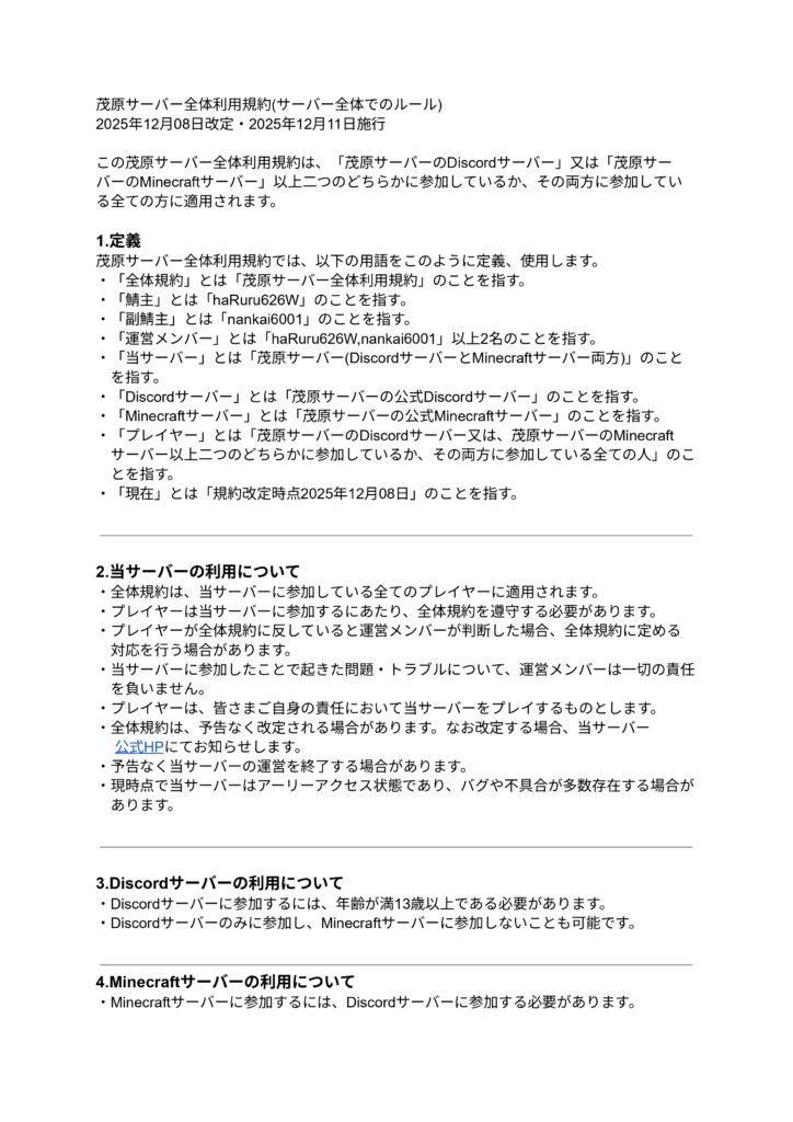 利用規約 2025.11.152025.12.11 ※HP上に表示されているものはPDFではなく画像の為、文字のコピー等は行えません。 文字のコピー等を行いたい場合は、恐れ入りますが下記よりPDF版をご覧ください。 茂原サーバー全体利用規約_2025年12月08日改定版ダウンロード
