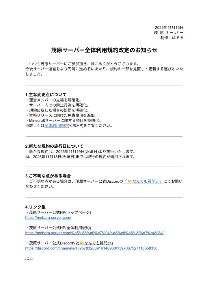 茂原サーバー全体利用規約改定のお知らせ2025_11_15 2025年 2025.11.15 ※HP上に表示されているものはPDFではなく画像の為、文字のコピー等は行えません。 文字のコピー等を行いたい場合は、恐れ入りますが下記よりPDF版をご覧ください。 茂原サーバー全体利用規約改定のお知らせ2025_11_15ダウンロード